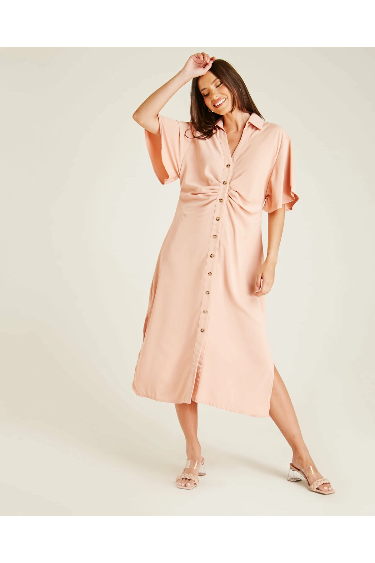 Dusty Pink Ruched Front Button Up Dress | Dusty Pink