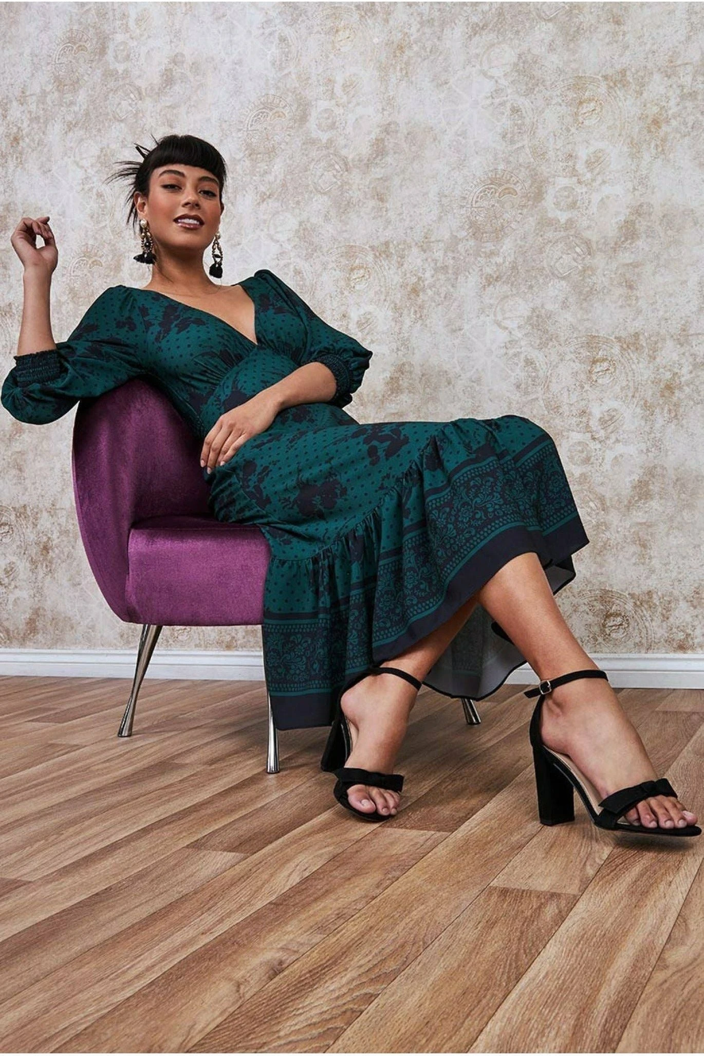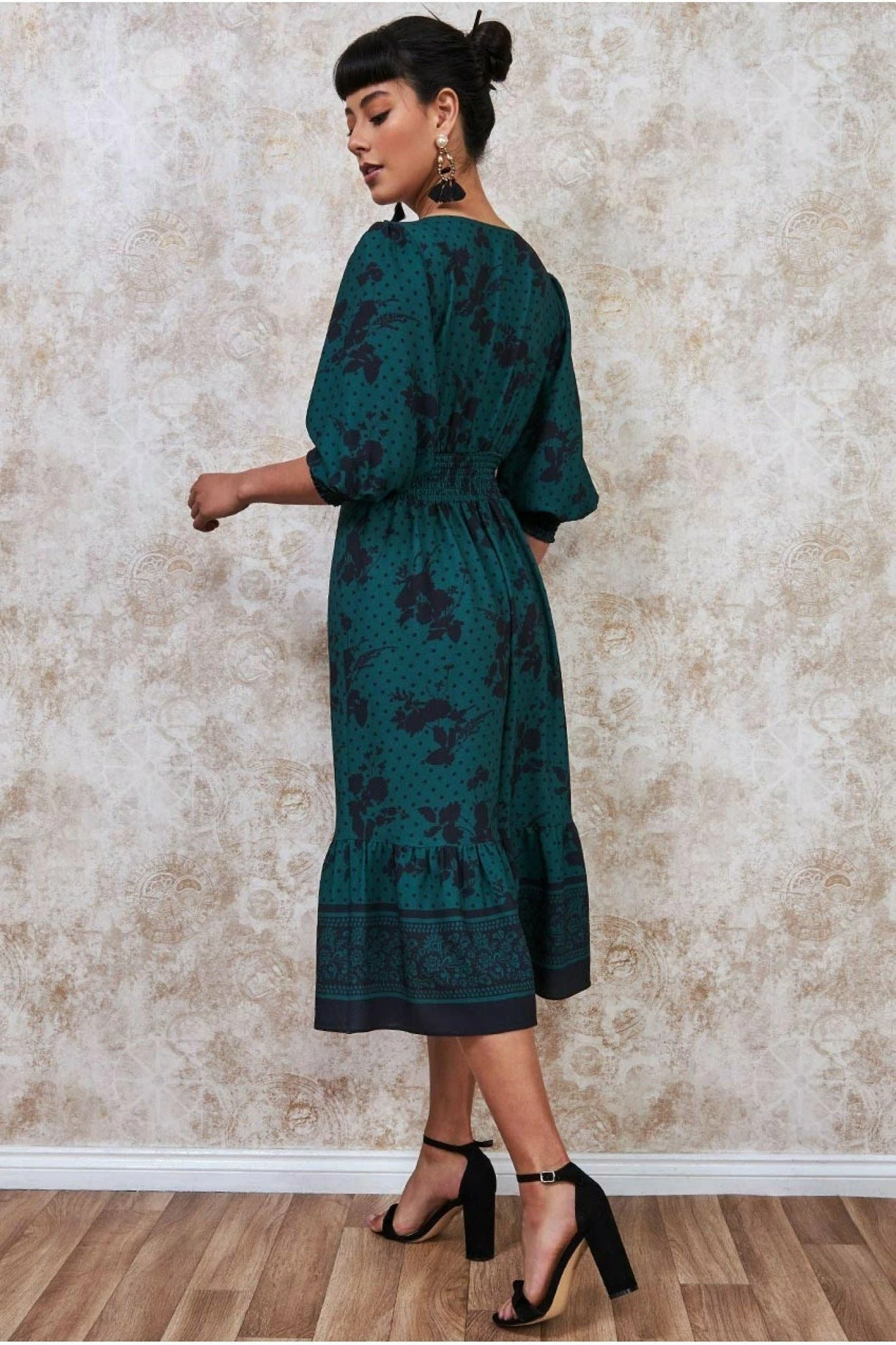 Goddiva Floral Print Puff Sleeve Midi Dress – Emerald Green