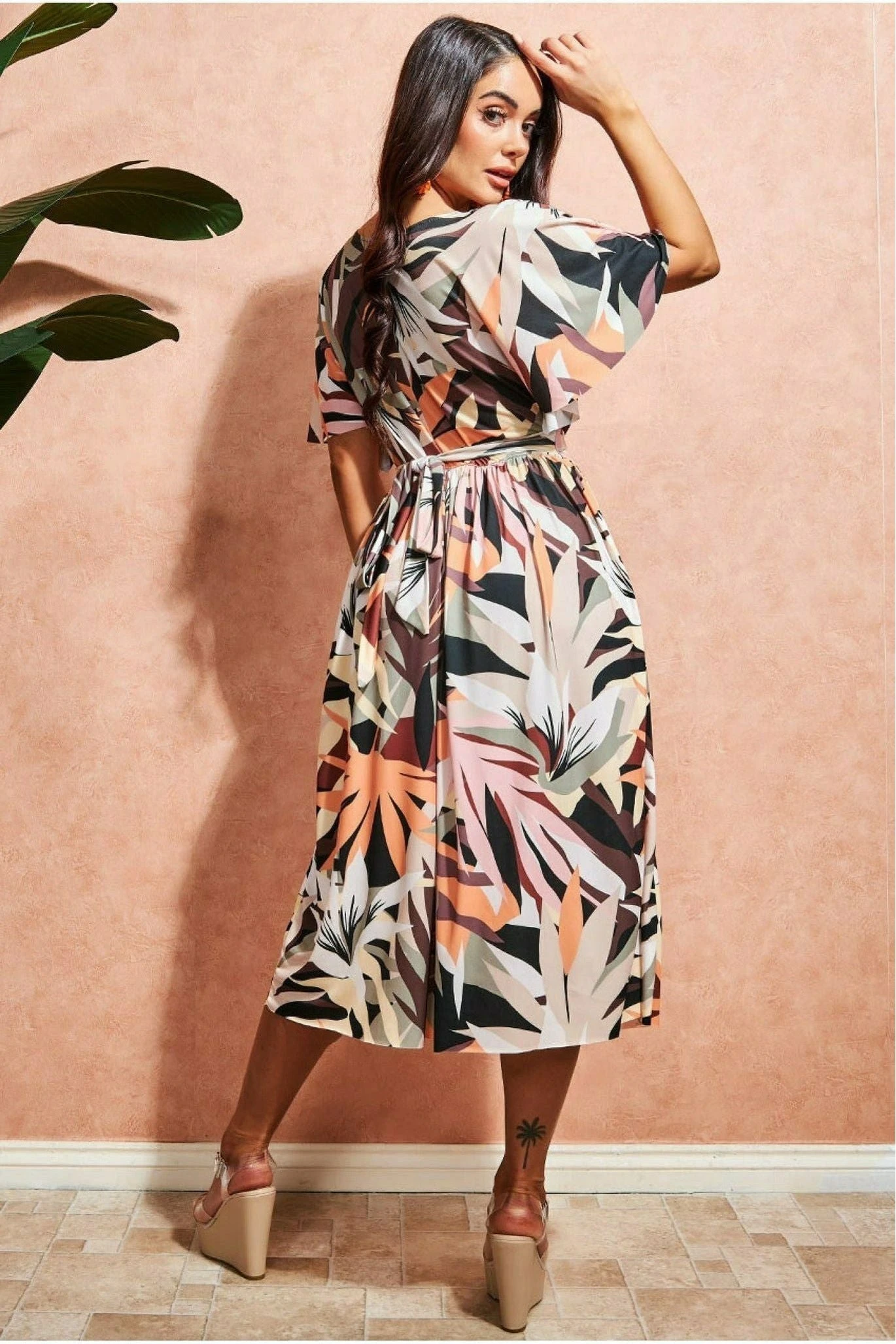 Leaf Print Midi Dress with Flutter Sleeves. A beautiful and delicate summer dress that is perfect for any occasion, whether it be a lunch date, a wedding or just a holiday. Made from soft cotton fabric, this dress will make you feel comfortable all day long! In its tredining brown colour, this printed summer dress is perfect to go from day to night, all with a change in shoes and accessories. This lightweight number is perfect for summer nights, with its faux wrap neckline, flutter sleeves and below the knee length, teamed with its earthy tones, you can’t go wrong with this dress.