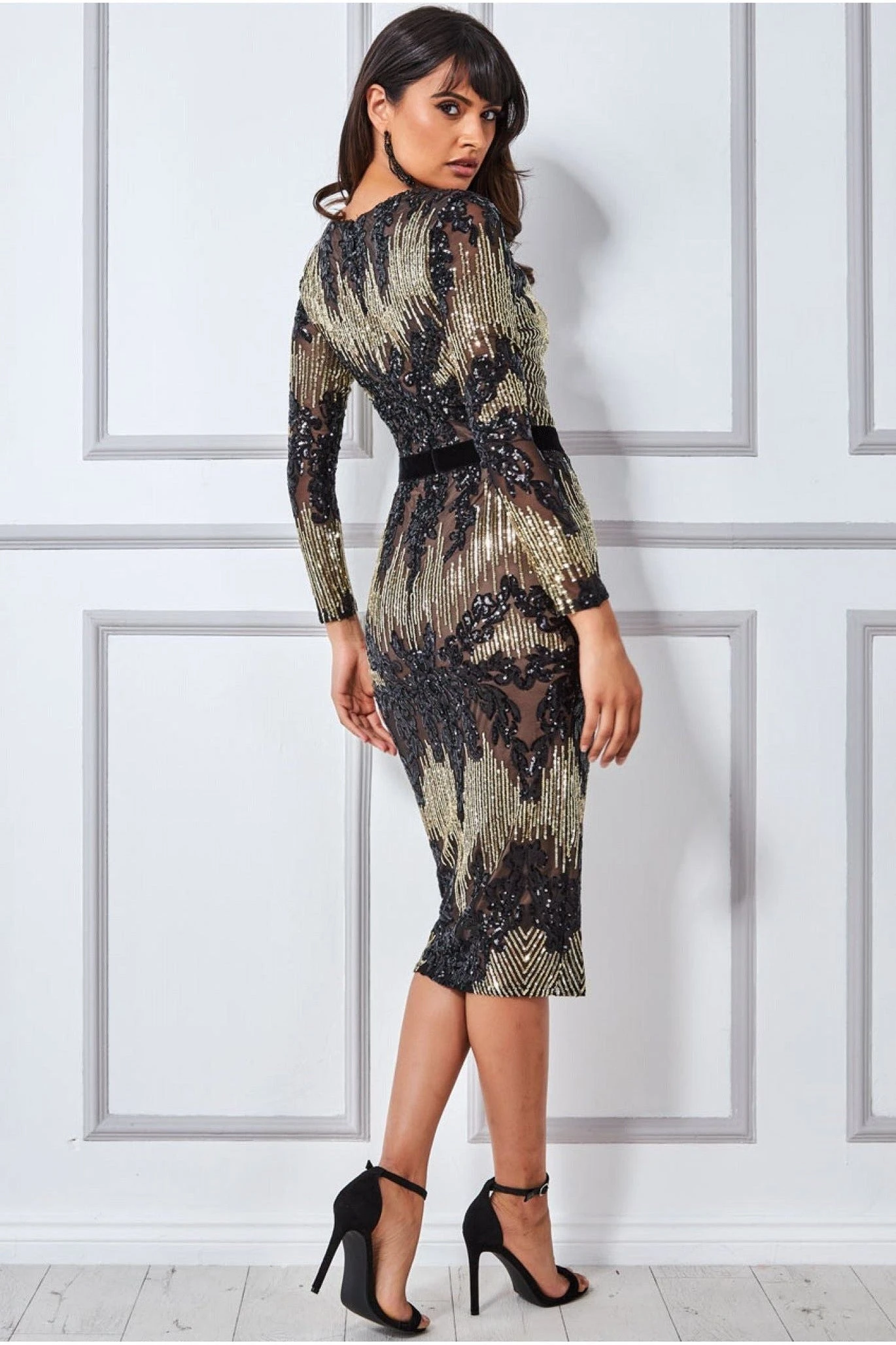 Goddiva Long Sleeve Sequin Party Midi Dress – Black