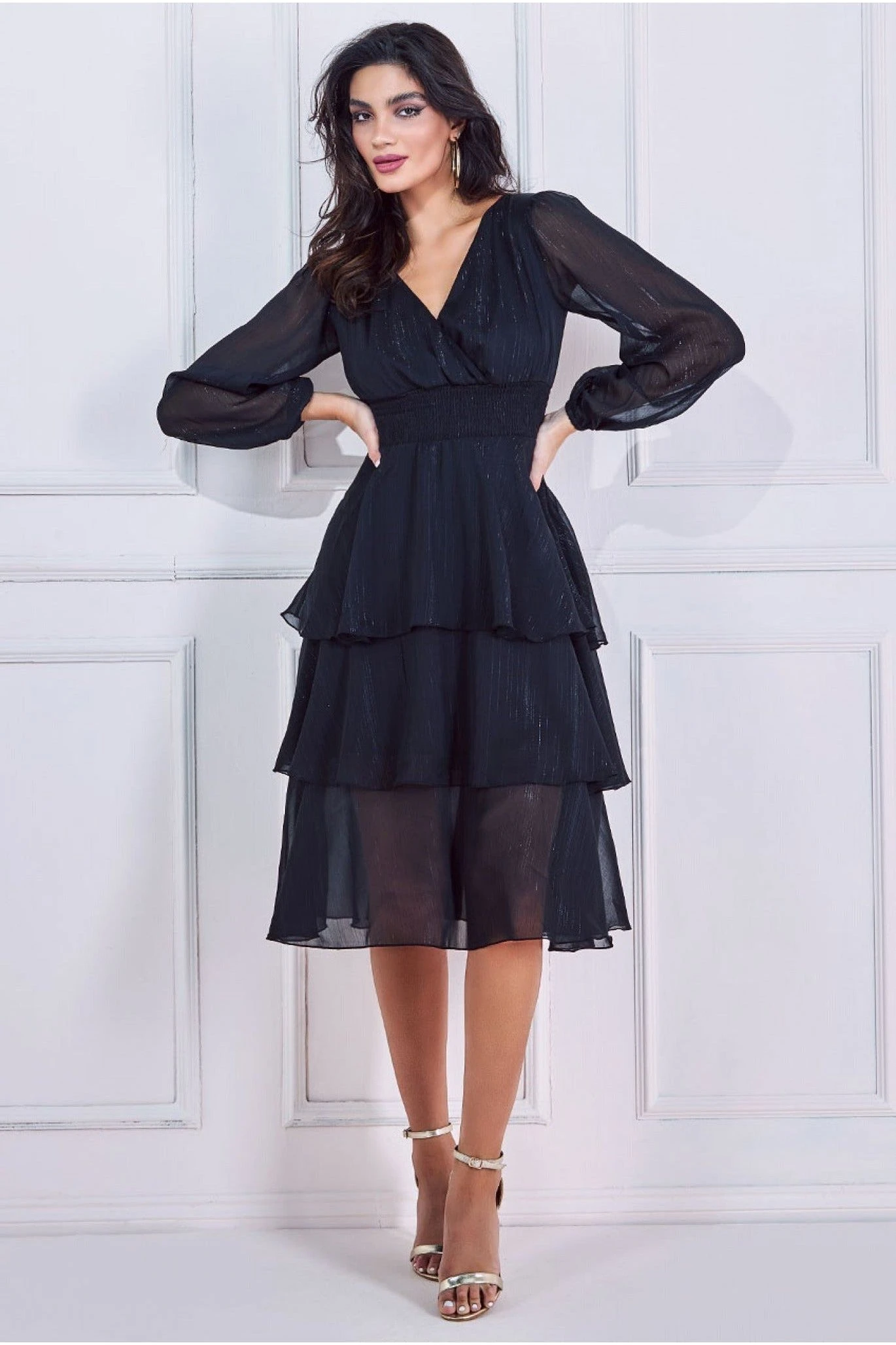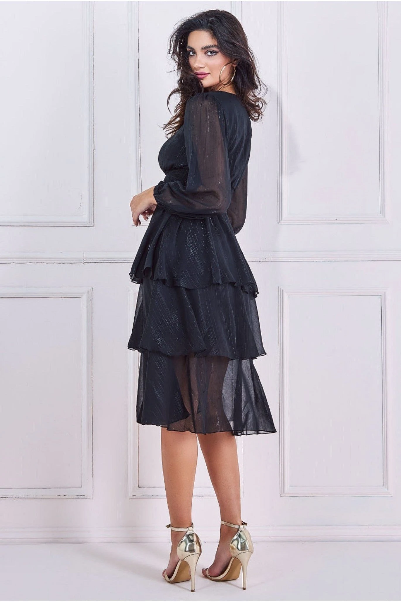 Introducing our stunning long sleeve tiered lurex midi dress, the ultimate choice for wedding guests and semi-formal occasions. This dress is a true showstopper, with its elegant and stylish design that is sure to turn heads. This black dress features a shimmering lurex fabric that adds a touch of glamour and sophistication. The tiered design creates a flattering silhouette that accentuates your curves while ensuring maximum comfort and mobility. With its versatile midi length and long sleeves, this dress is perfect for any semi-formal occasion. Whether you’re attending a wedding or a cocktail party, you can be sure to make a statement in this gorgeous LBD. So why wait? Add some glamour to your wardrobe today with our long sleeve tiered lurex midi dress and get ready to shine at your next special event.
