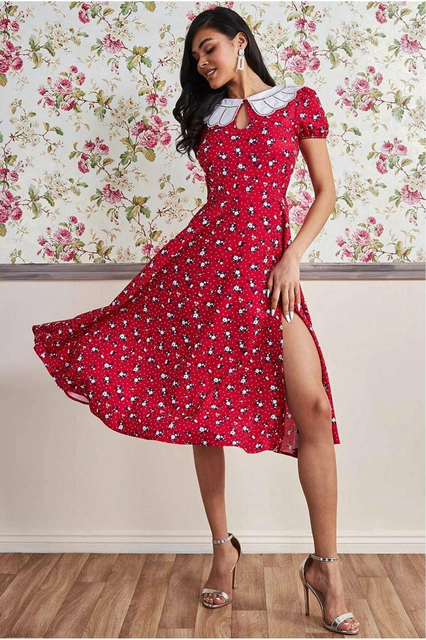 This printed midi with a front split from Printed is a wardrobe essential. The round neckline with collar attached, scalloped detail on the collar and front split will create a flirtatious look. In its eye-catching red color teamed with an all-over floral print is the perfect party piece that you can wear on any occasion. With its beautiful floral print design and front thigh split, not to mention a great fit, you will feel like a million dollars when wearing this dress. This bold & beautiful number is a perfect piece for casual affairs as well as jazz it up for a semi-formal occasion. Teamed with the right shoes & accessories, this short summer dress is perfect for wedding guests, date nights, BBQs, garden parties, and even brunch with friends.