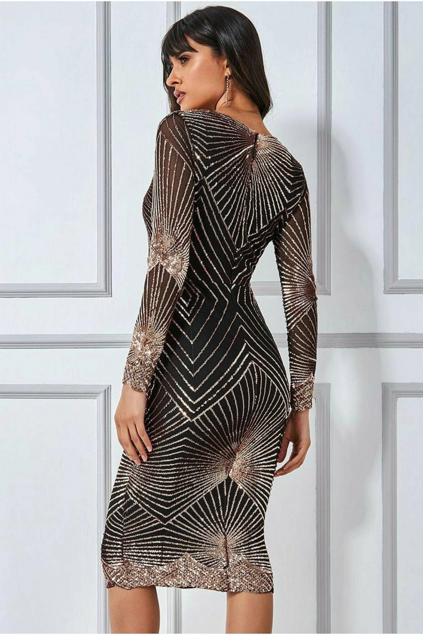 Bring some sparkling sass this party season in this delicious Goddiva sequin number. This scalloped hem starburst midi dress is the only dress you need this upcoming party season. In its stunning rose gold colour, this short party dress is the winning choice for your evening outings. With its long sheer sleeves, drizzled with champagne sequins, and a starburst effect across the body, this dress will have you sparkling from dusk ‘till dawn. A perfect choice in outfit for wedding guests, nights out on the town, cocktails with the girls, even that overdue date night. This versatile blue midi party dress is also a certified winner for Christmas parties, new years eve celebrations or even a glitz and glam birthday. This art décor gold number is ticking all the boxes this season, especially with its figure flattering bodycon style, this glamorous evening occasion dress will have you looking like the star you are.