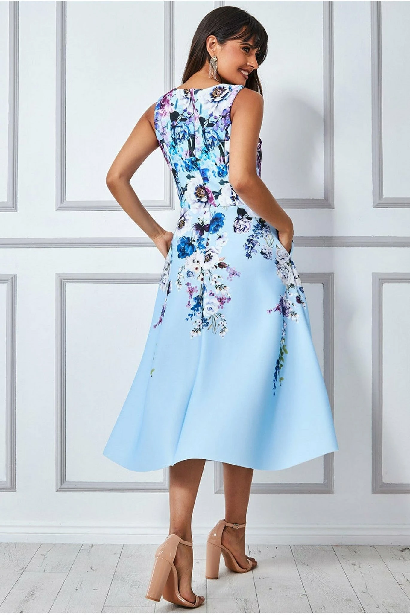 Goddiva Scuba Foam Floral Midi Dress – Light Blue