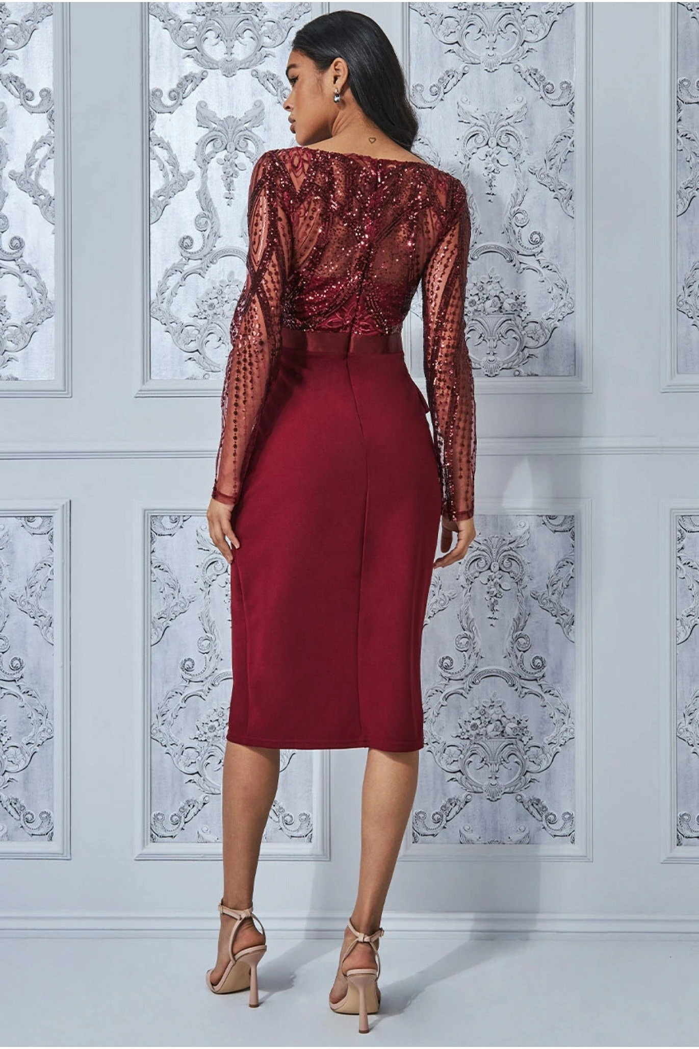 Goddiva Sequin Bodice With Front Frill Midi Dress – Wine