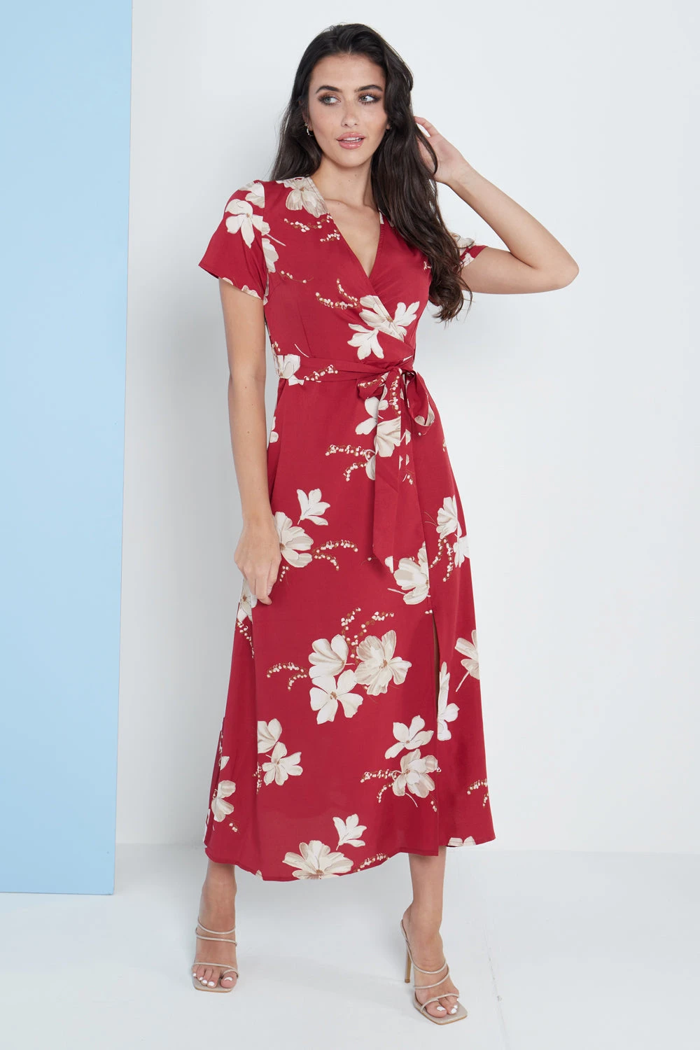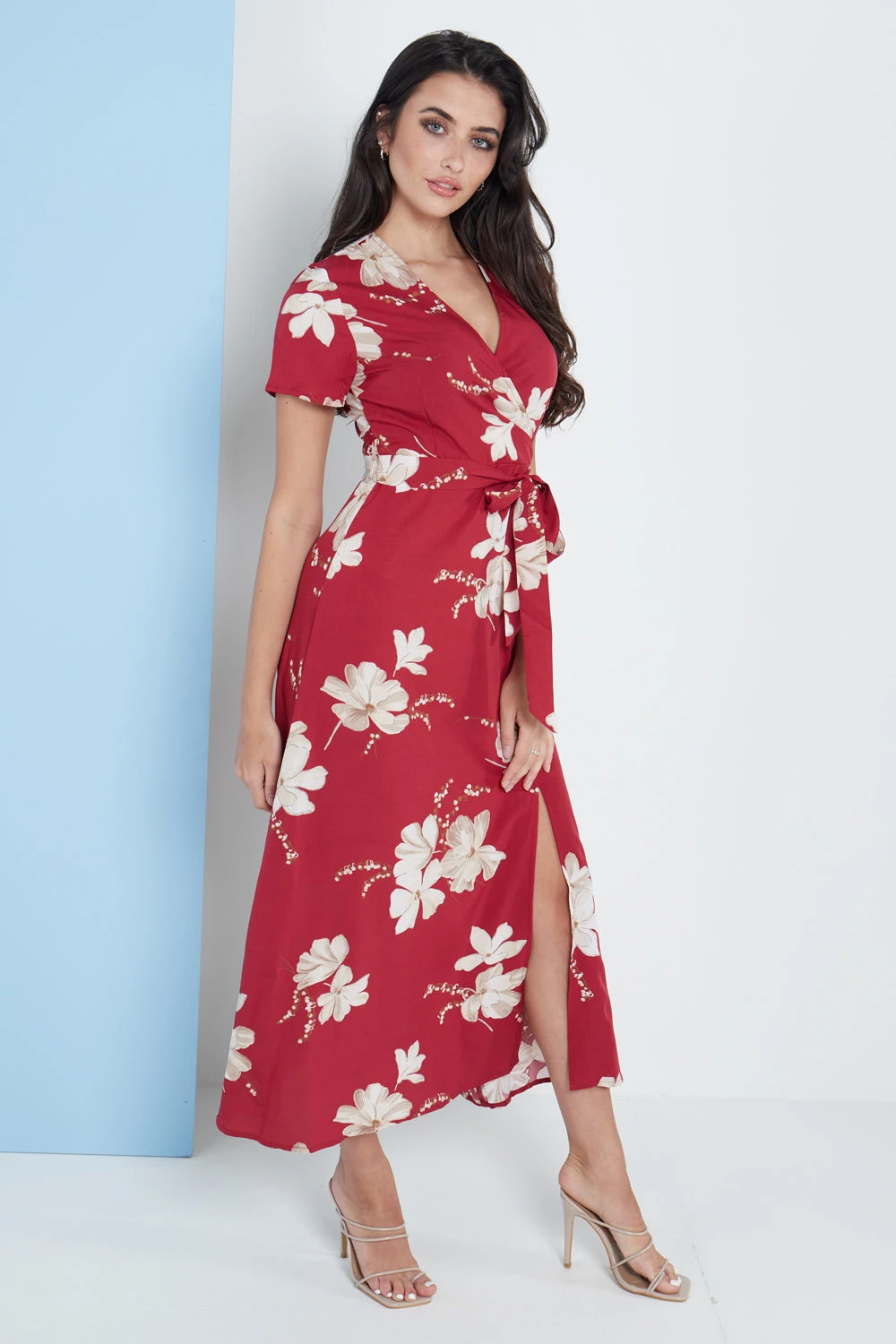 Update your summer-worthy wardrobe with this maxi dress. Featuring a gorgeous red floral print fabric with a wrap design, plunge neckline, a tie waist and a leg split detail. Team with some strappy heels and a mini bag for day drinks with the girls.