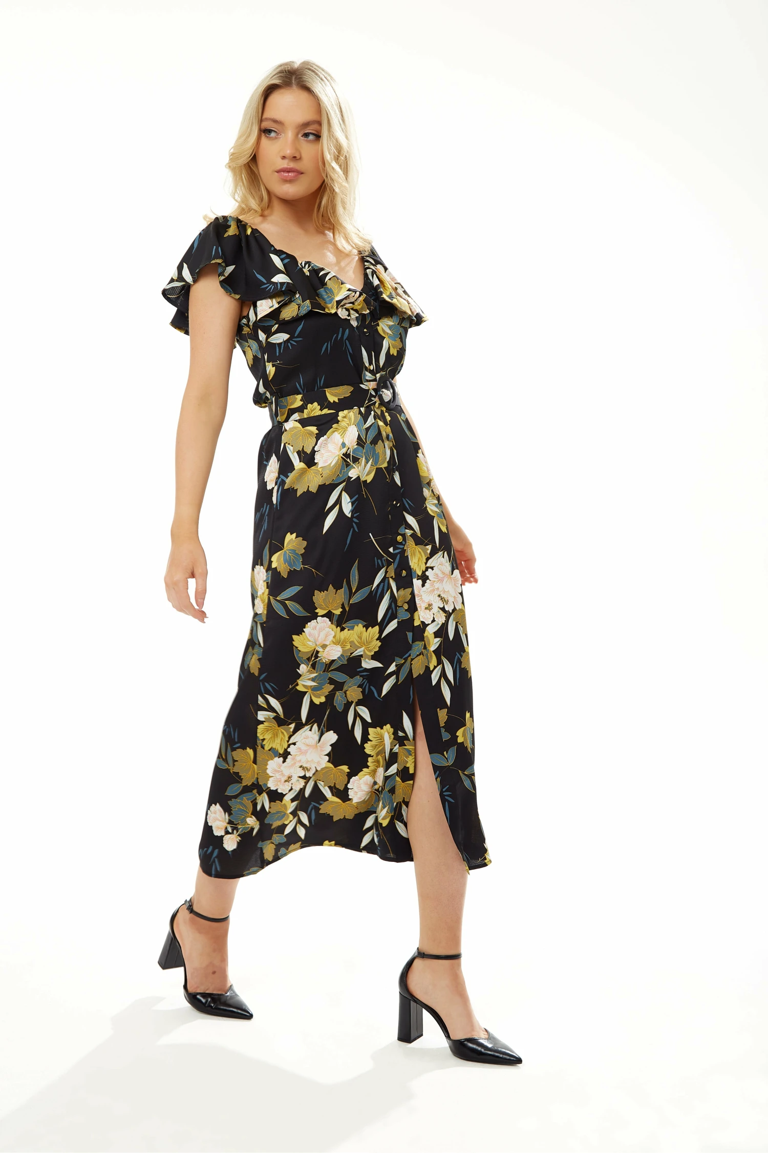 Lilura London Wrap Front Split Leg Maxi Dress In Black Daisy