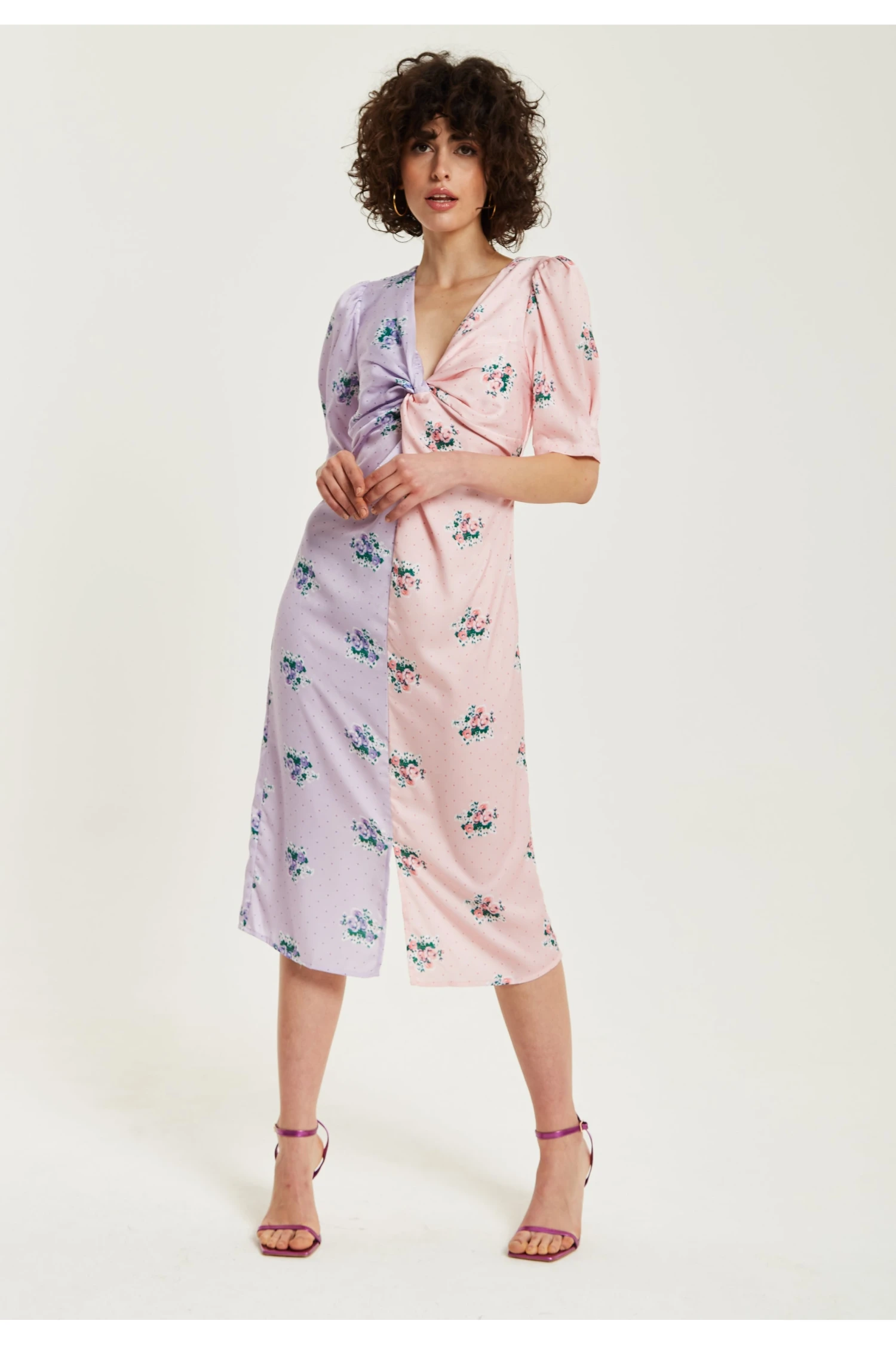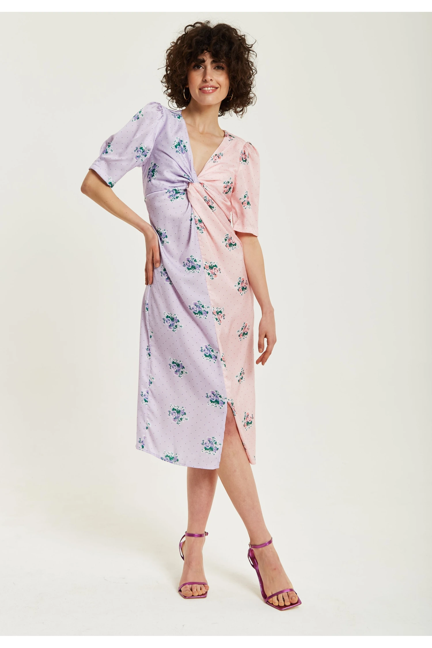Liquorish Lilac And Pink Floral Knot Front Midi Dress