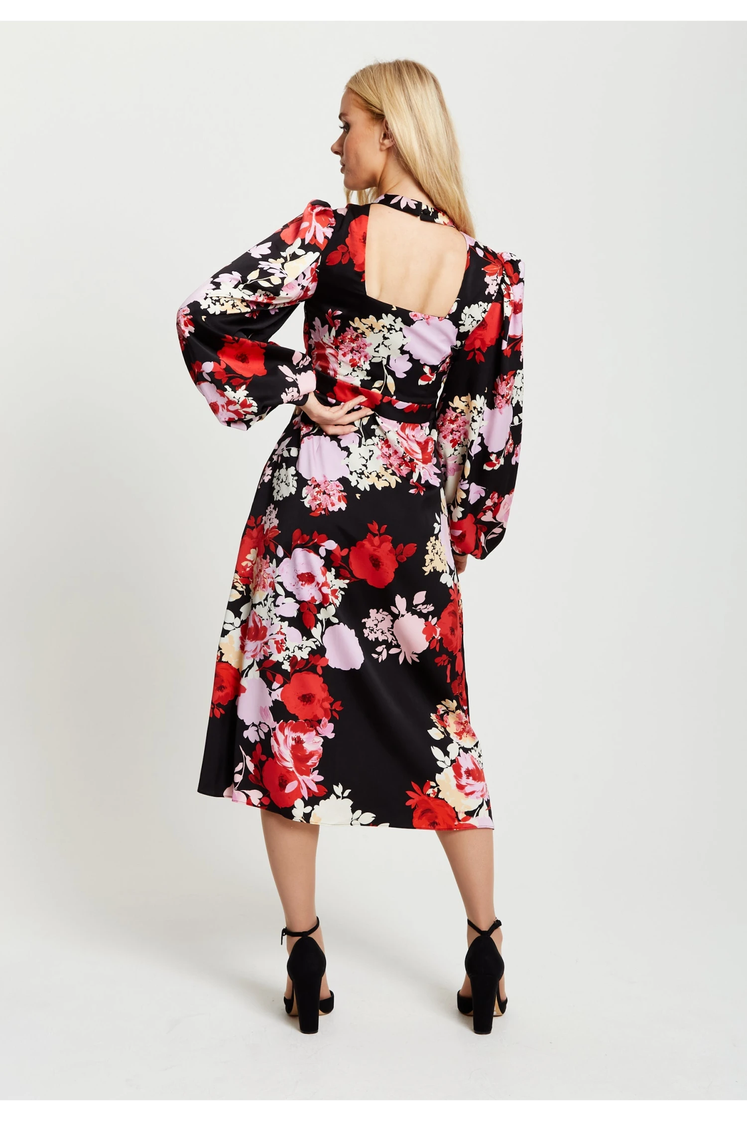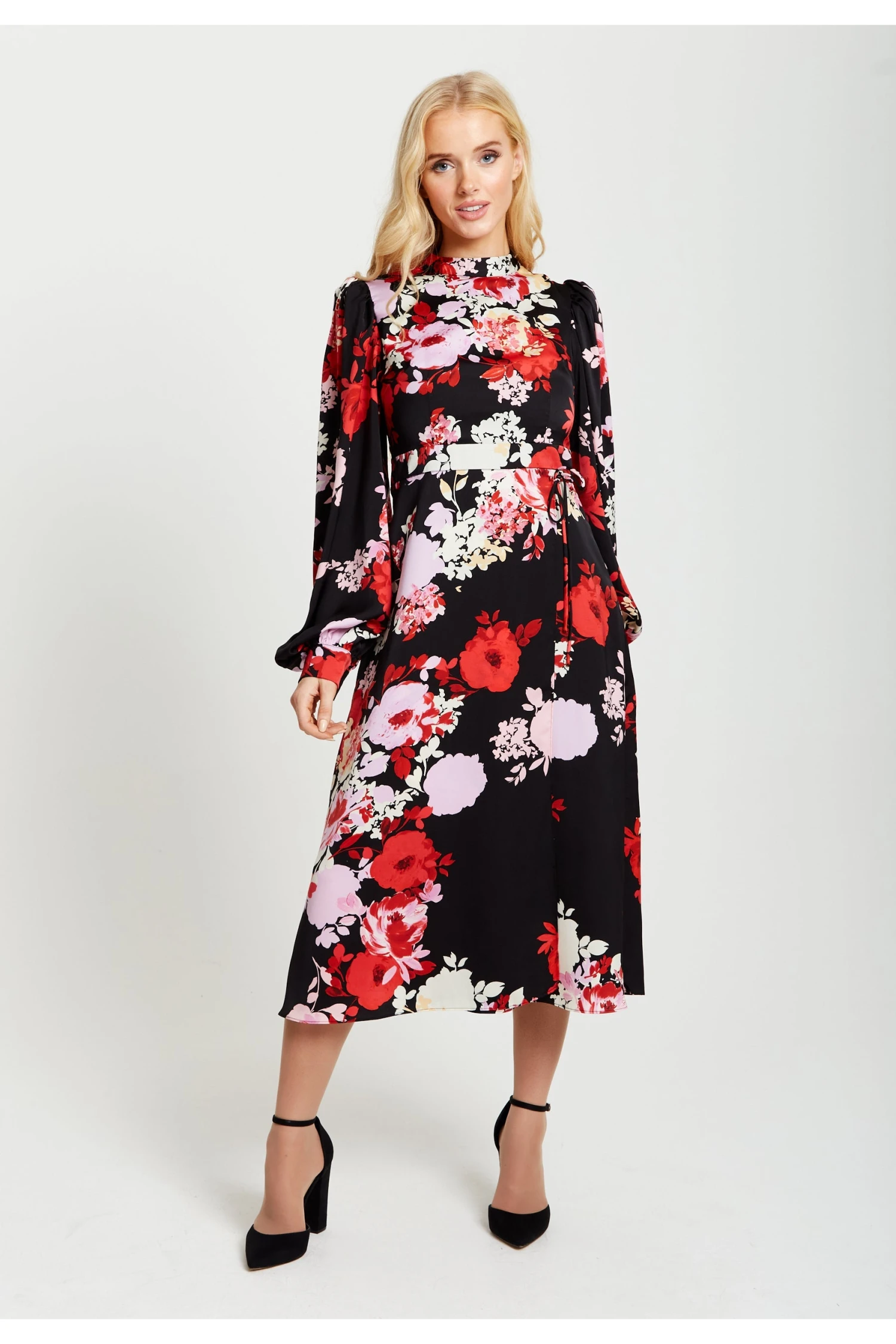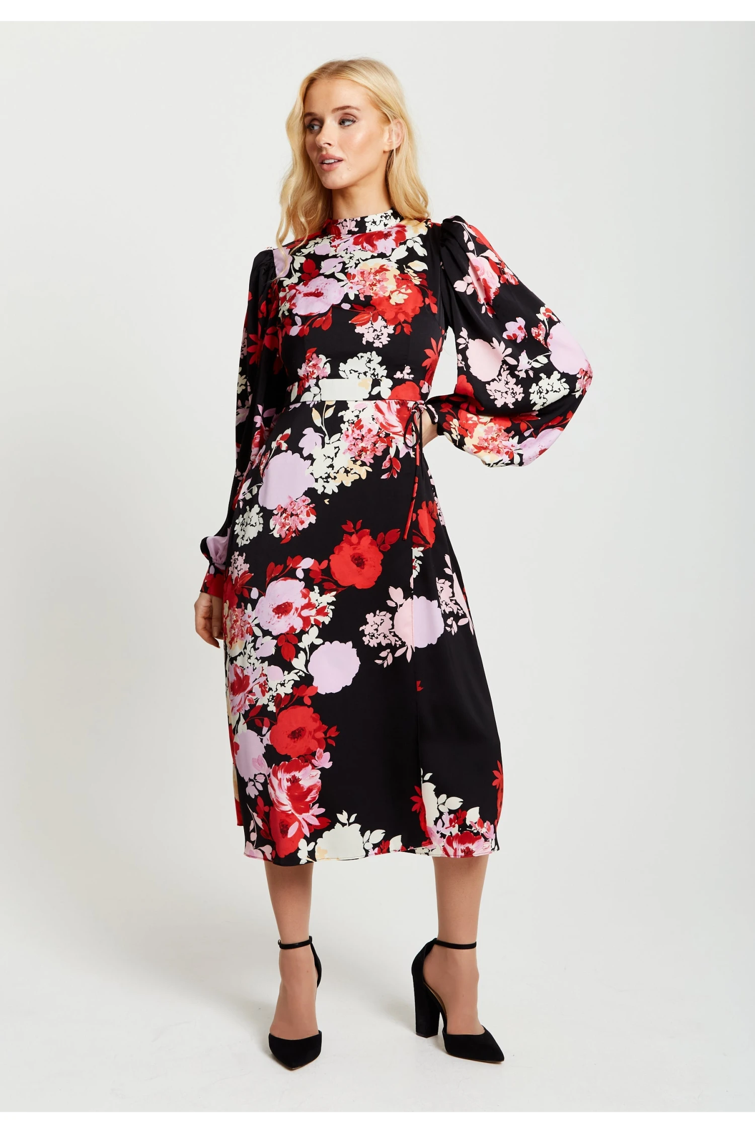 The perfect dress to add some warmth to your wardrobe this Autumn/Winter, with tones of rosy reds and pinks. The style includes long balloon sleeves and a midi length skirt making it the perfect piece to pair with knee high boots and an elegant coat for an impactful look or heels and statement earrings for a glamour look. The rose print features paint like textured roses in hues or vibrant pinks and reds against a contrasting black background.