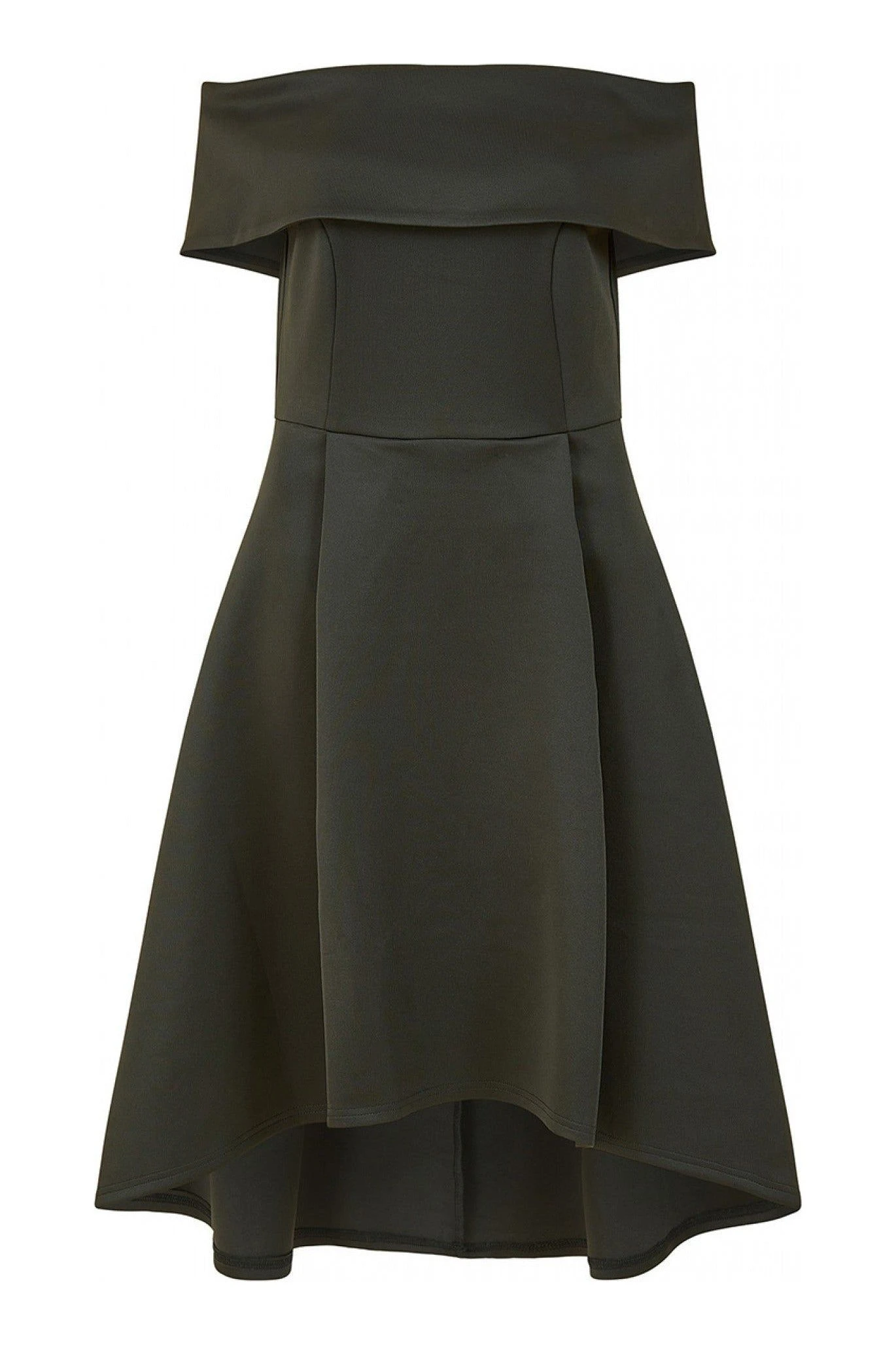 The Mela Black Bardot Dipped Hem Dress is calling to be worn for all the special occasions this season. The fold over Bardot neckline is flattering and the shape overall is enhanced by the cinched in bodice and skater style skirt that has a dipped back.