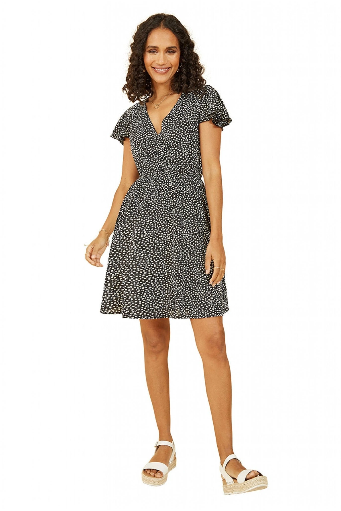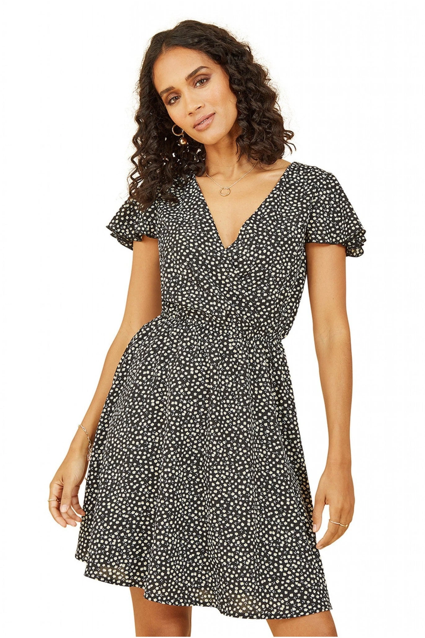A cute addition to your wardrobe, this Black Mela Ditsy Daisy Printed Skater Dress has a micro floral print in a light fabric. It has a relaxed silhouette that cinches at the waist, with ruffle sleeves adding a feminine touch.