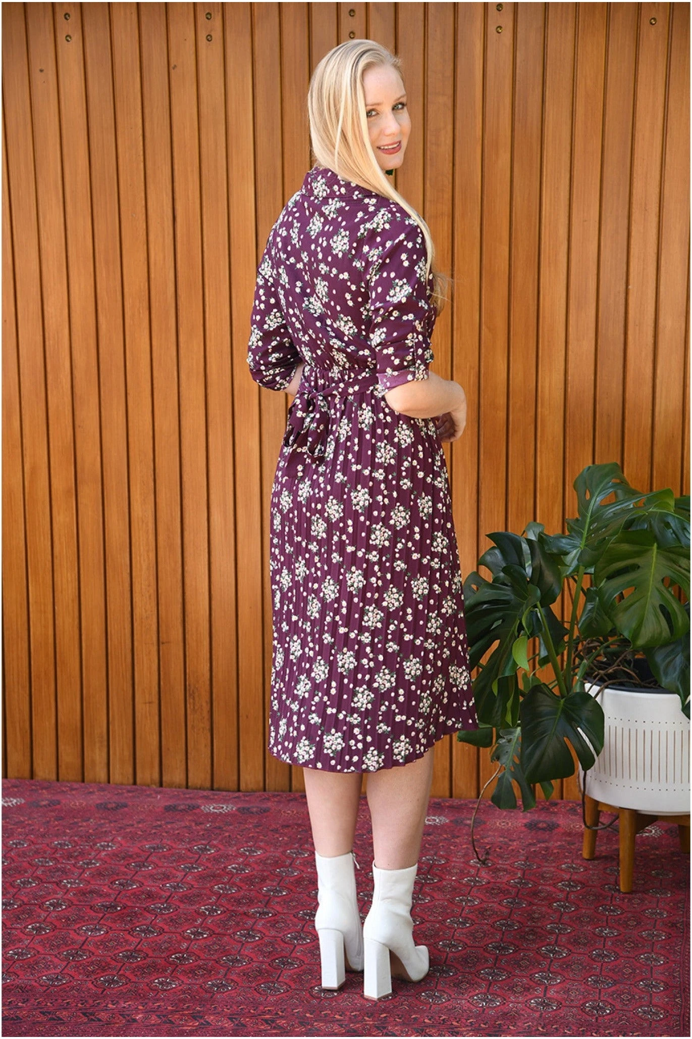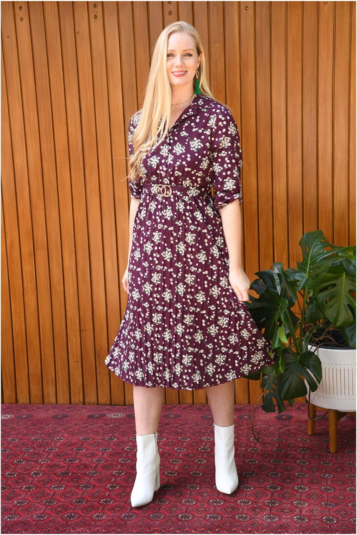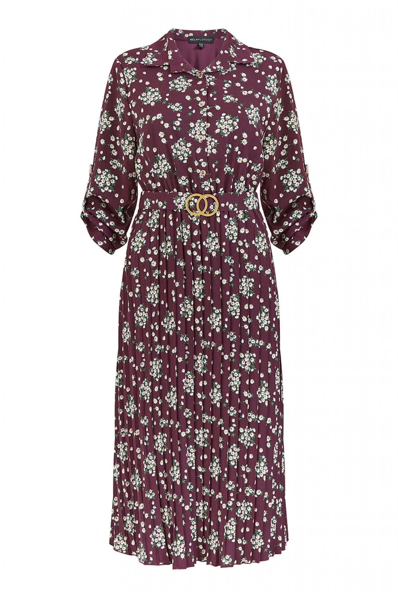 Mela London Burgundy Ditsy Daisy Pleated Midi Dress