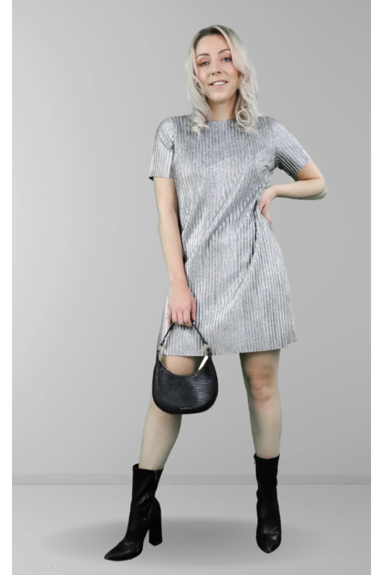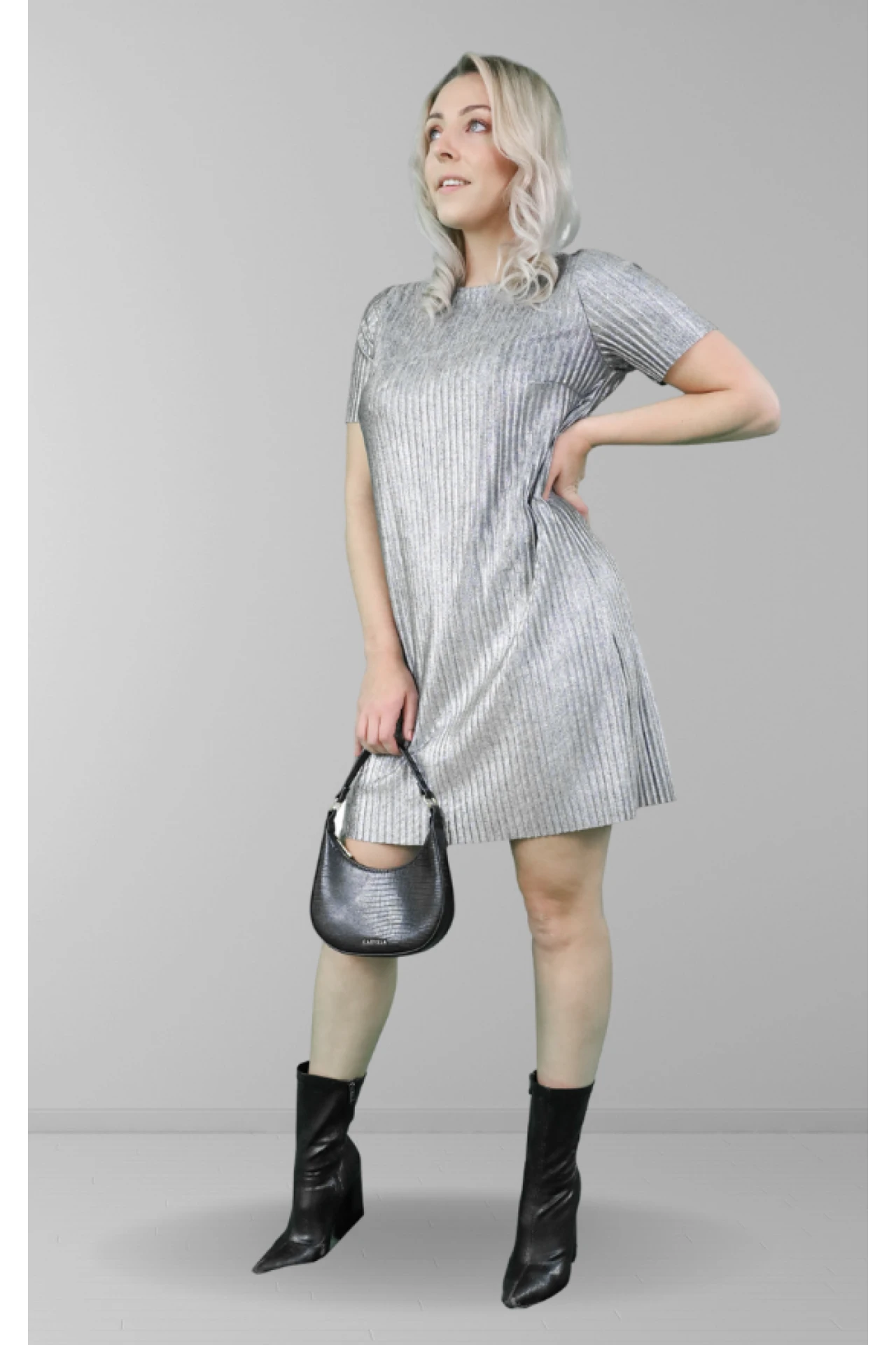 SHORT SLEEVE DRESS IN GREY PLISSE FABRIC.