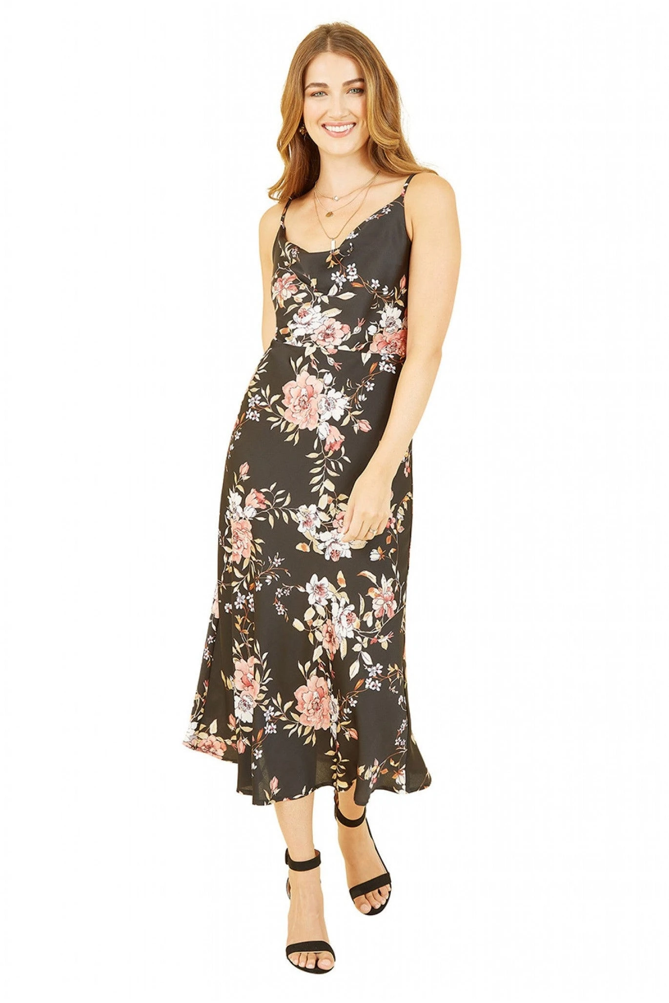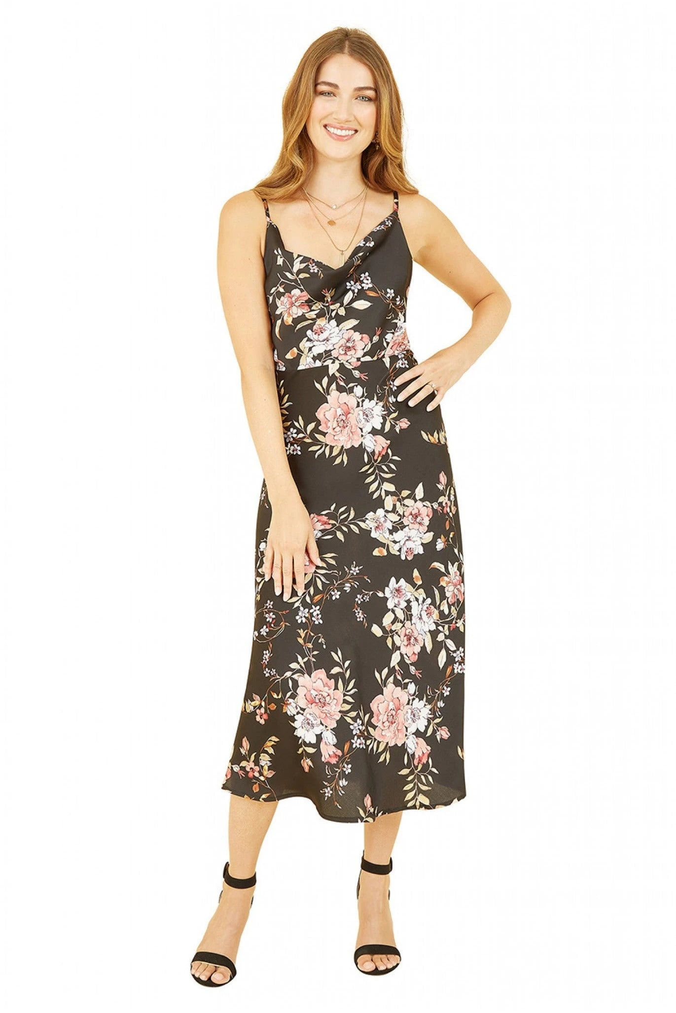 Yumi Black Satin Floral Cowl Neck Slip Dress