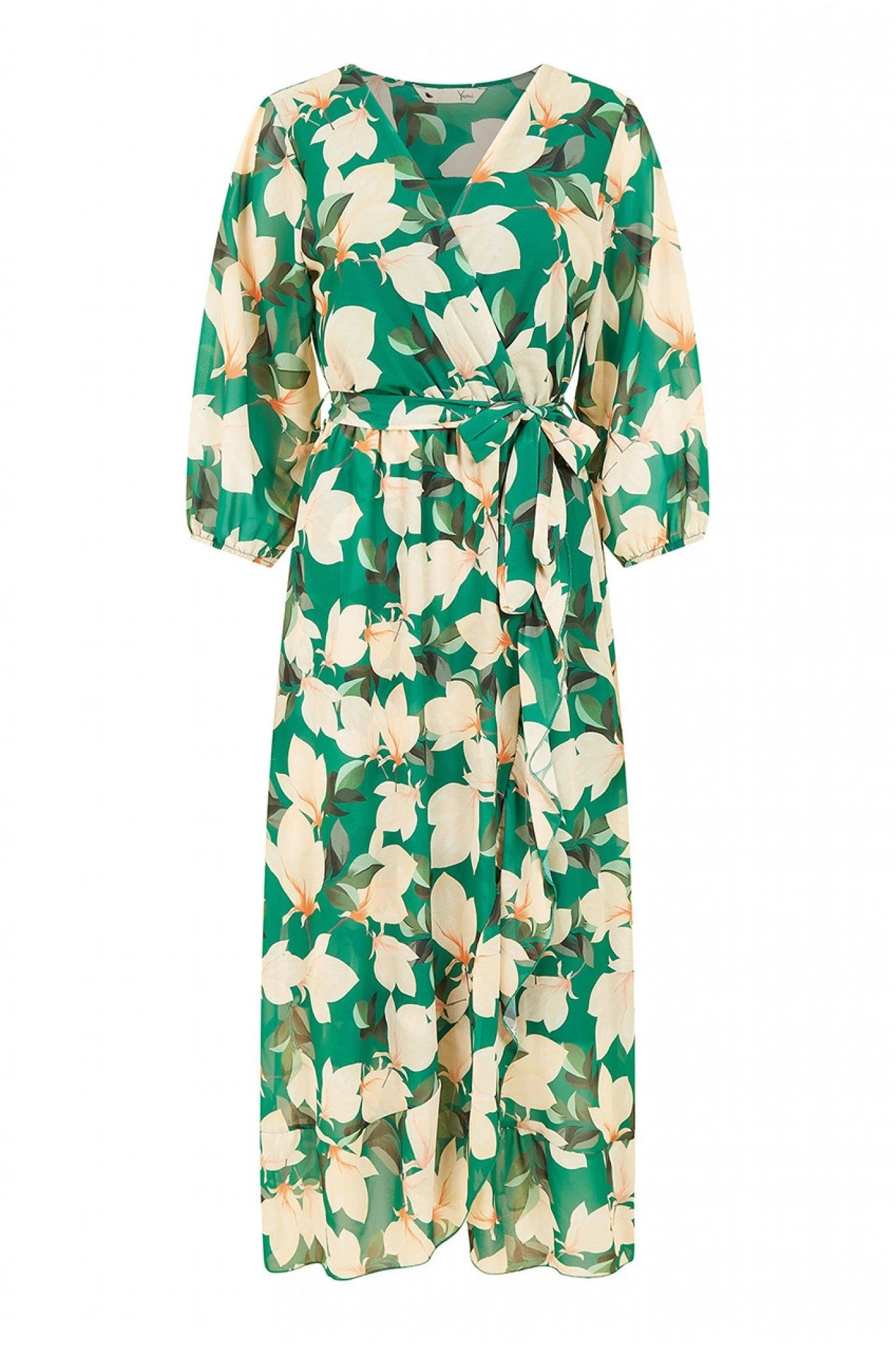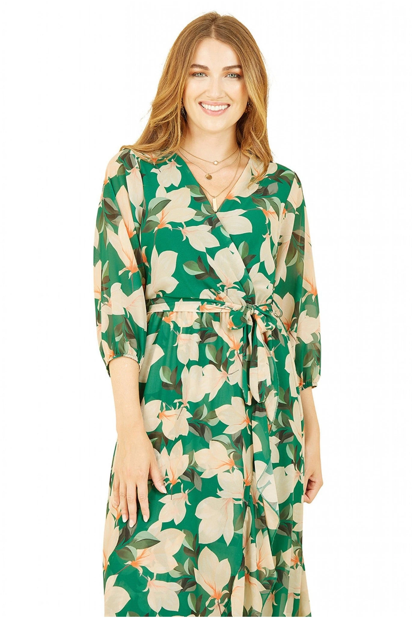 Yumi Green Blossom Wrap Midi Dress With 3/4 Sleeves