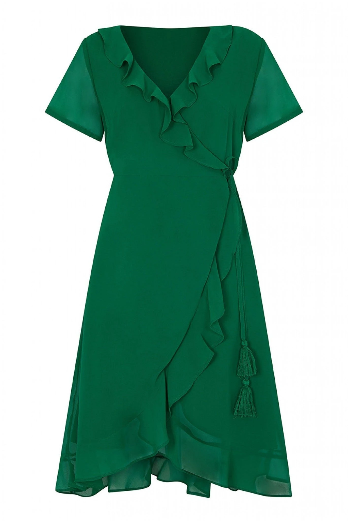 Twirl into the party spirit with the Yumi Green Frill Wrap Dress. It’s cut in a classic wrap shape with gentle ruffles running from shoulder to hemline. The waist is pulled in by a tie that’s enhanced by a stylish tassel, with a lining underneath to finish. Complete your look with block heels.