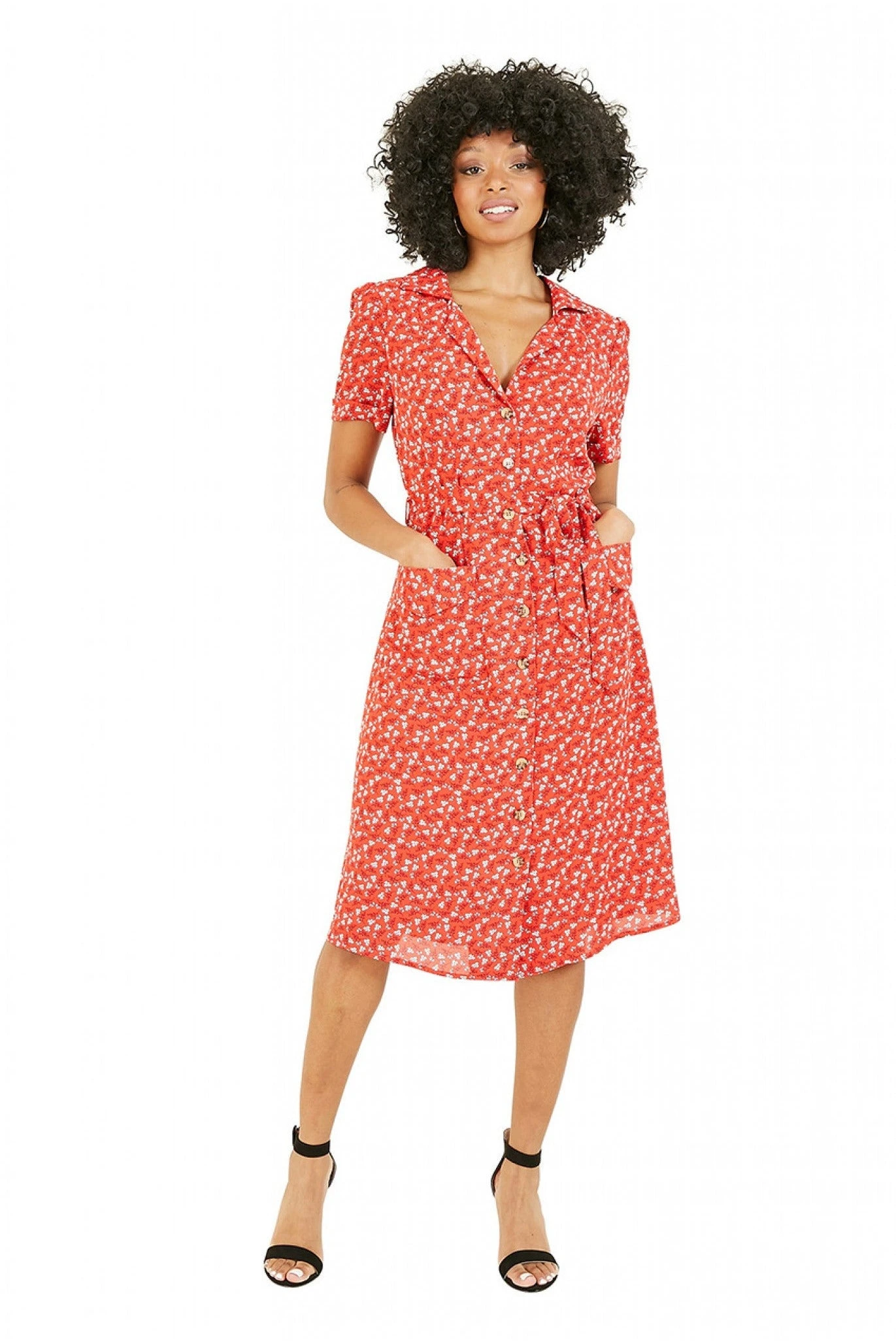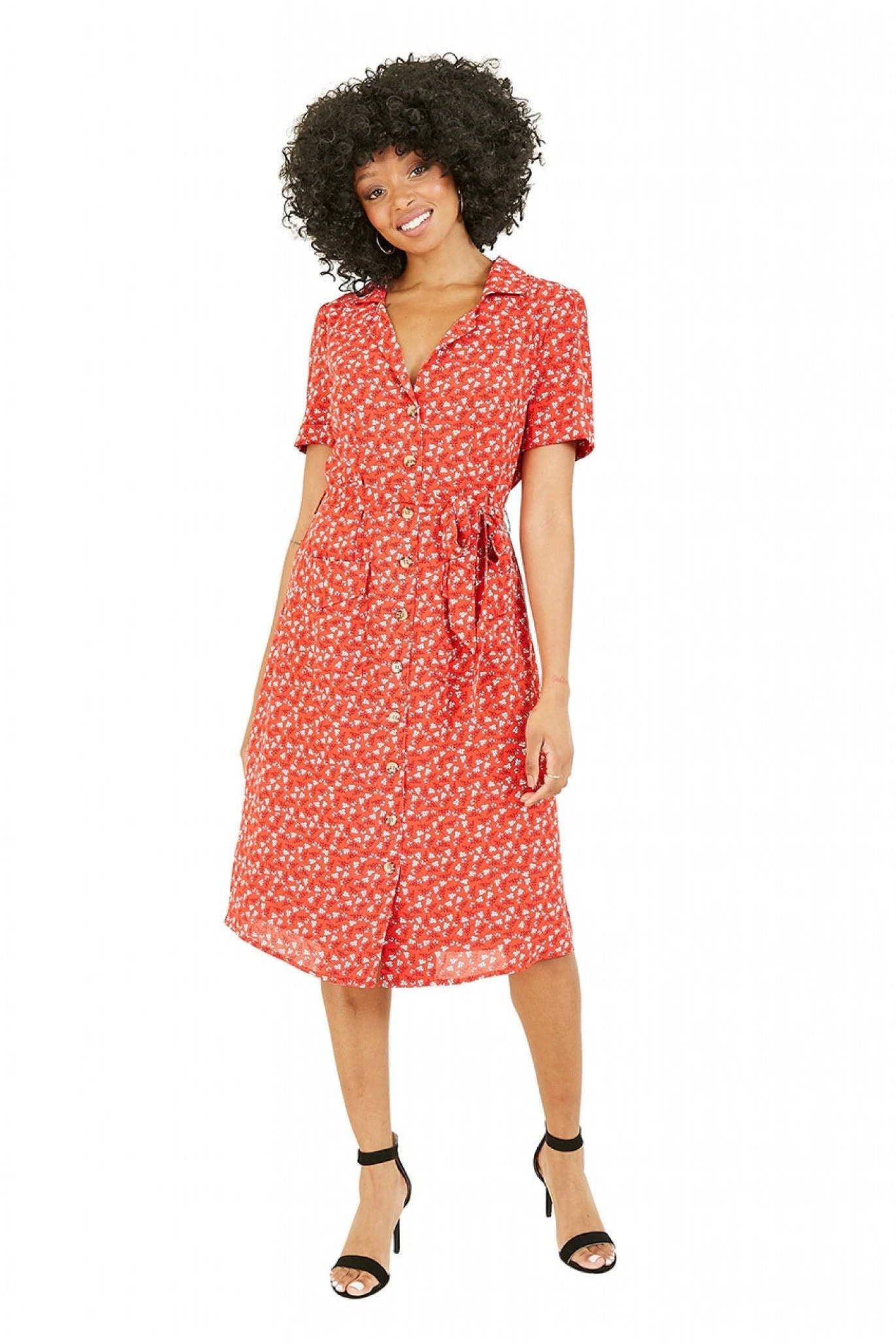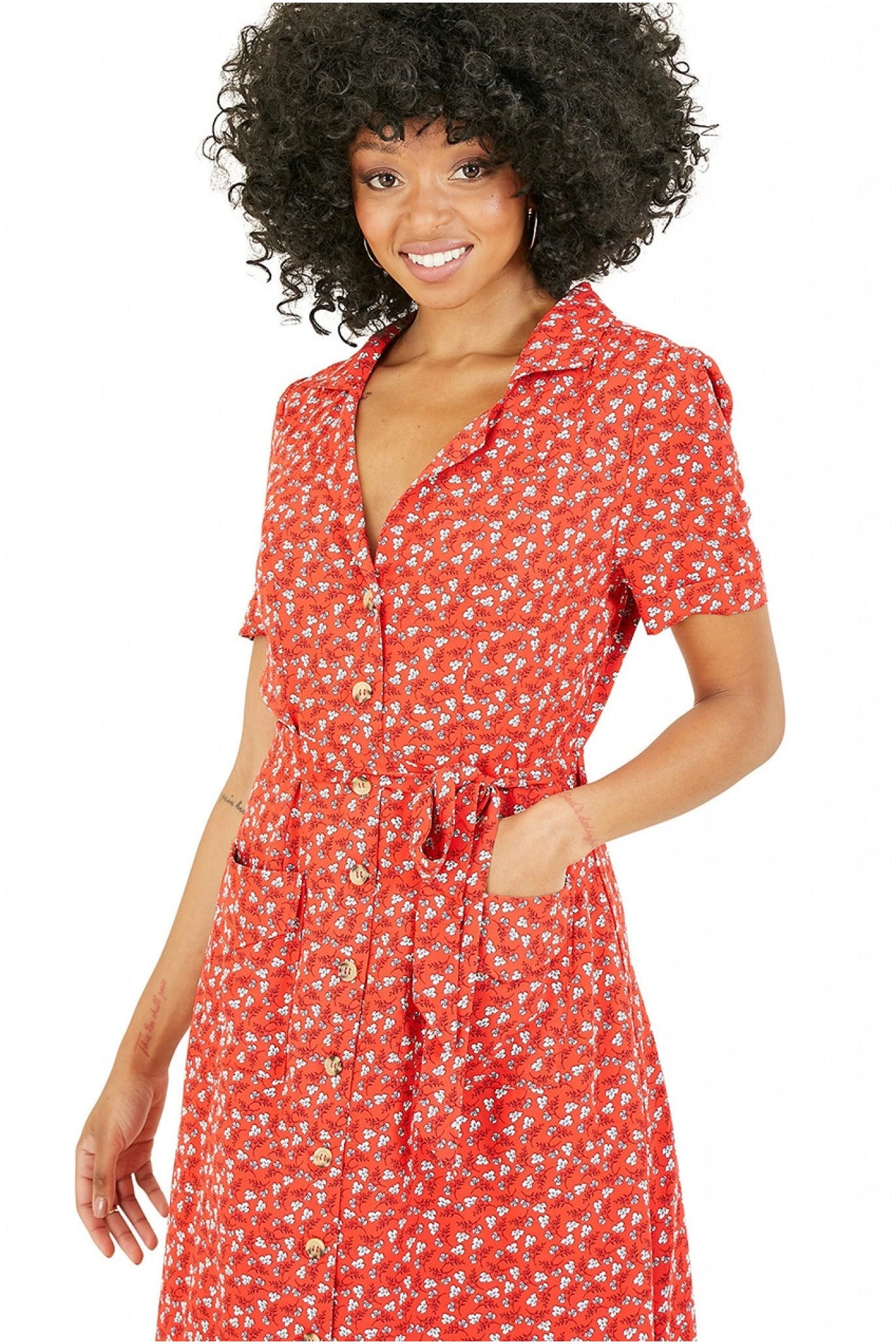 Yumi Red Ditsy Leaf Print Retro Shirt Dress